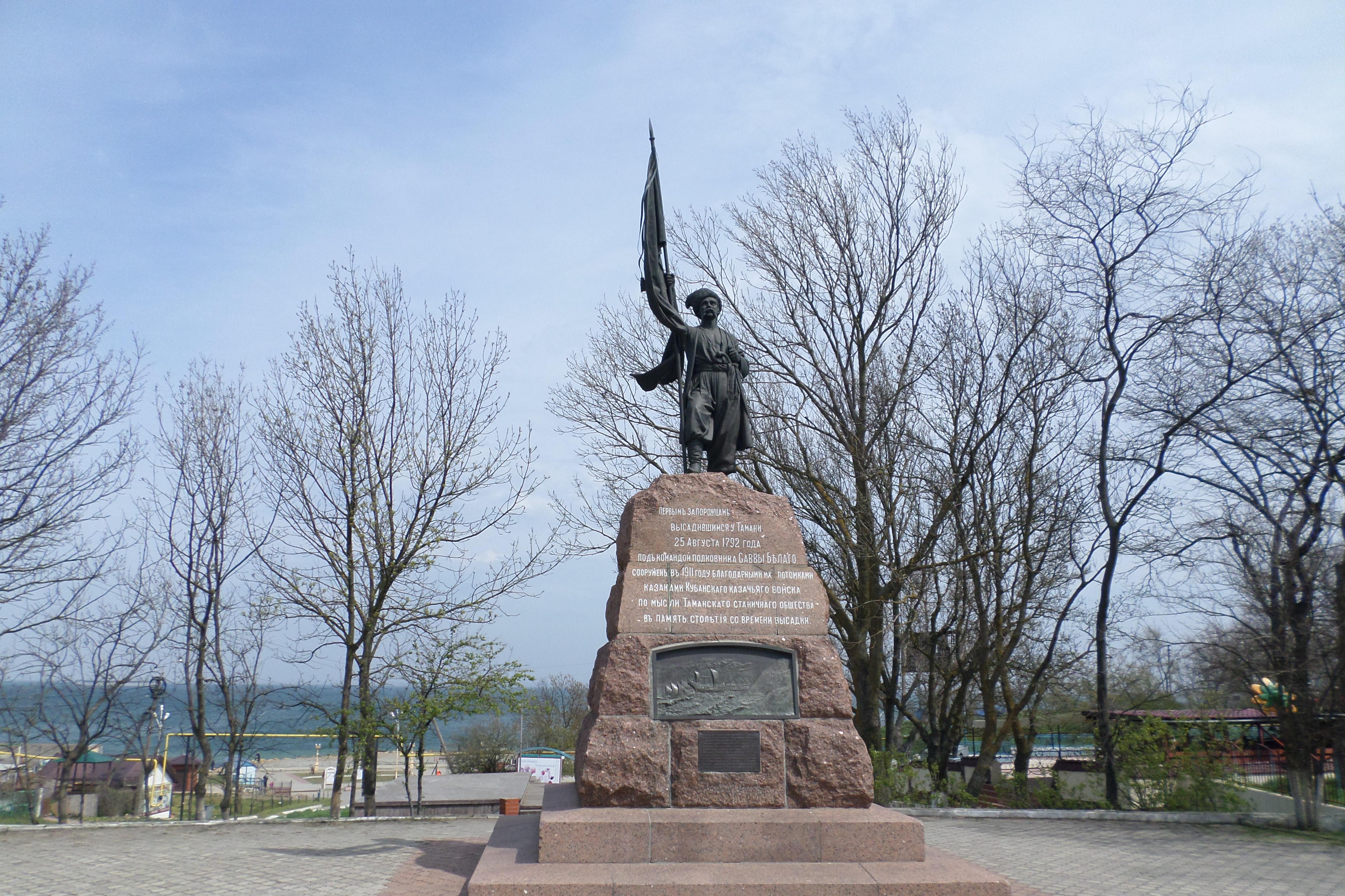 Первая остановка — у памятника казакам-запорожцам. Монумент напоминает о том, откуда пошли кубанские станичники — потомки запорожских казаков. Мы узнаем о переселении 1792 года и роли полковника Саввы Белого в основании первых казачьих поселений на Тамани.