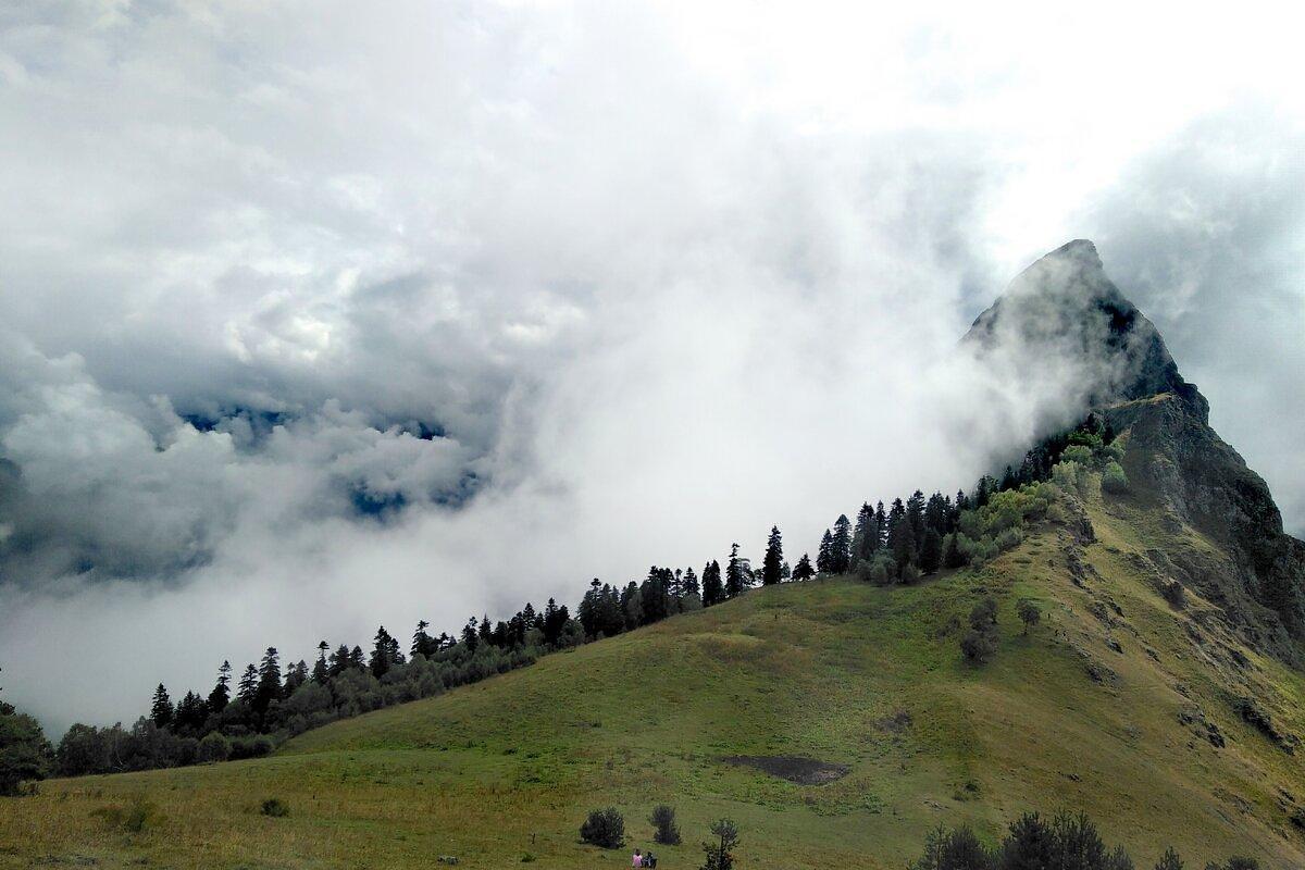 Последние метры подъёма — самые впечатляющие. Дорога идёт по хребту, и вот уже перед нами величественный Пик Закан (2271 м).