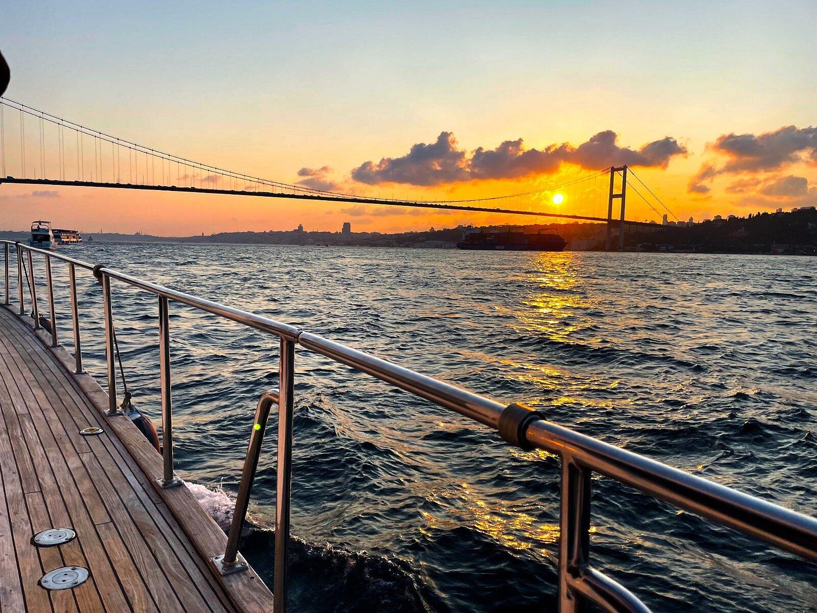 Уже вечером начинается наше первое настоящее знакомство с городом — круиз по проливу Босфор. Мы наблюдаем, как солнце медленно садится за горизонт, отражаясь в воде, а вдоль берегов проплывают величественные дворцы, старинные особняки и мечети. Атмосфера здесь по-настоящему магическая — лёгкий ветер, огни города и ощущение, что мы попали в красивый фильм.